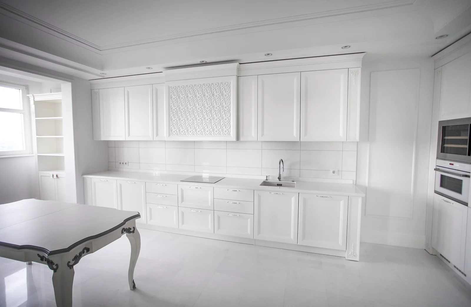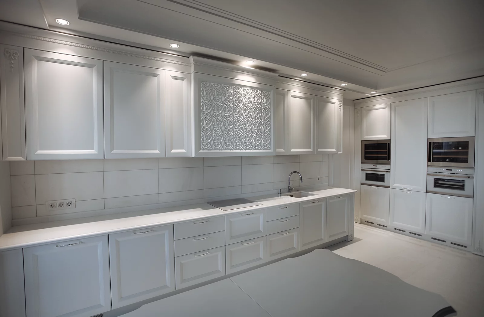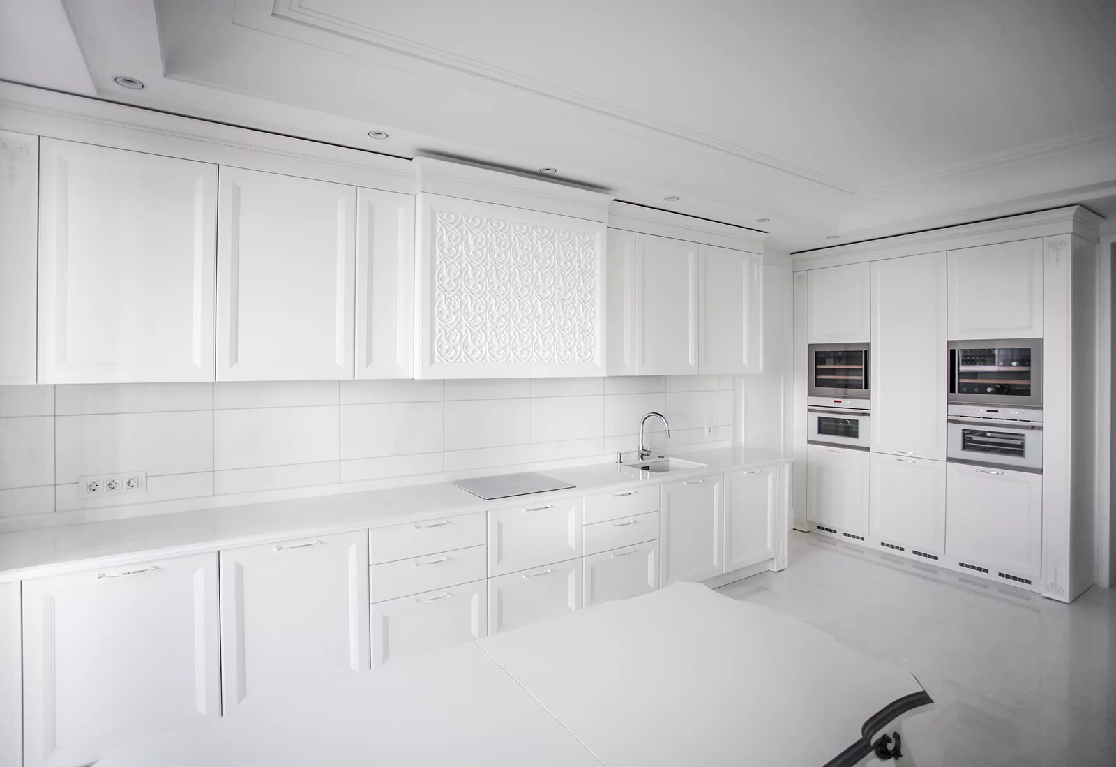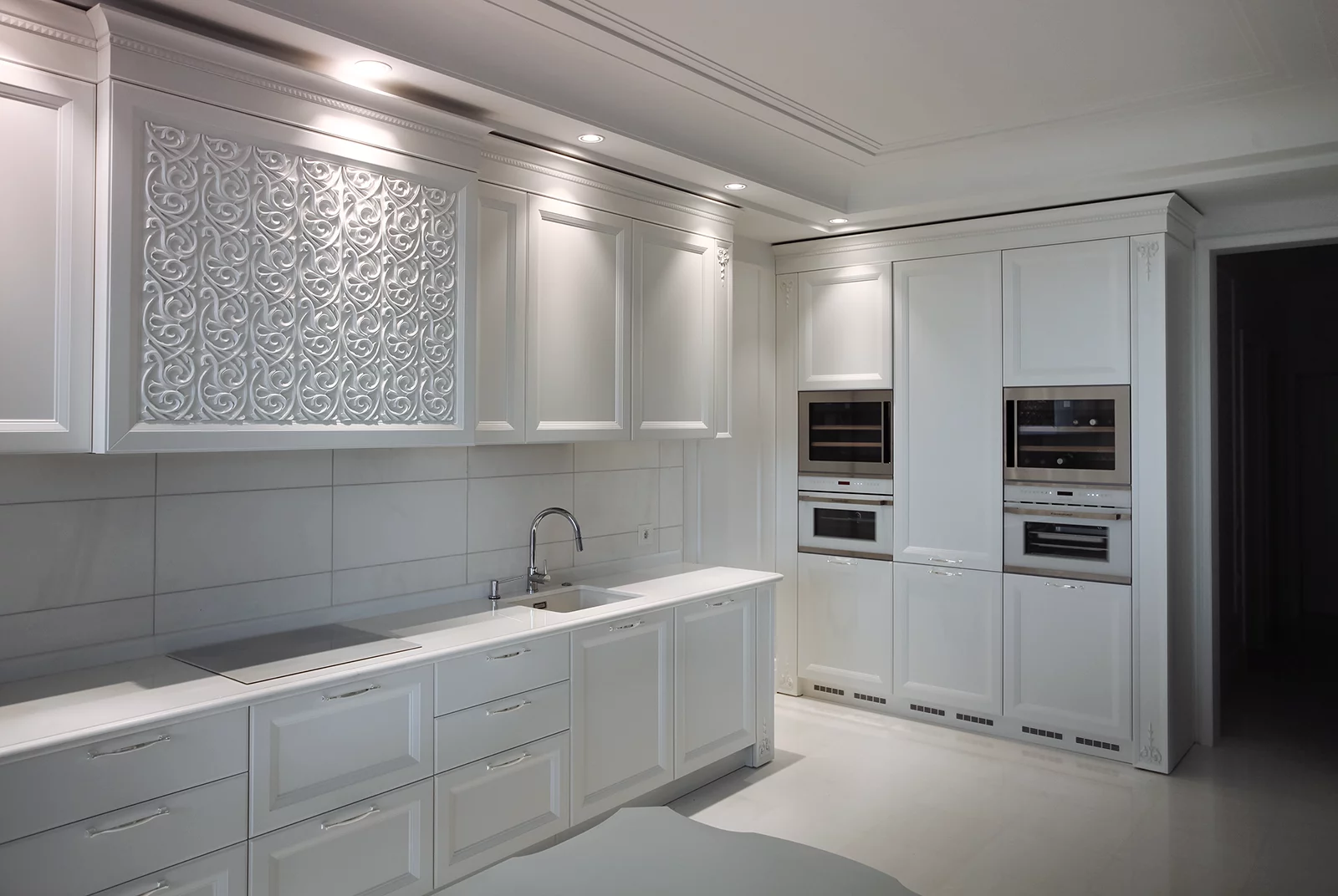 Проект кухни Princess от итальянской фабрики Castagna Cucine для квартиры в Москве. Гарнитур с фасадами белого цвета выполнен в стиле «современная классика» с элементами арт-деко. Над вытяжкой установлен раздвижной фасад с изящными резными элементами. Столешница изготовлена из кварцевого камня. Кухня укомплектована элитной бытовой техникой Kuppersbusch.