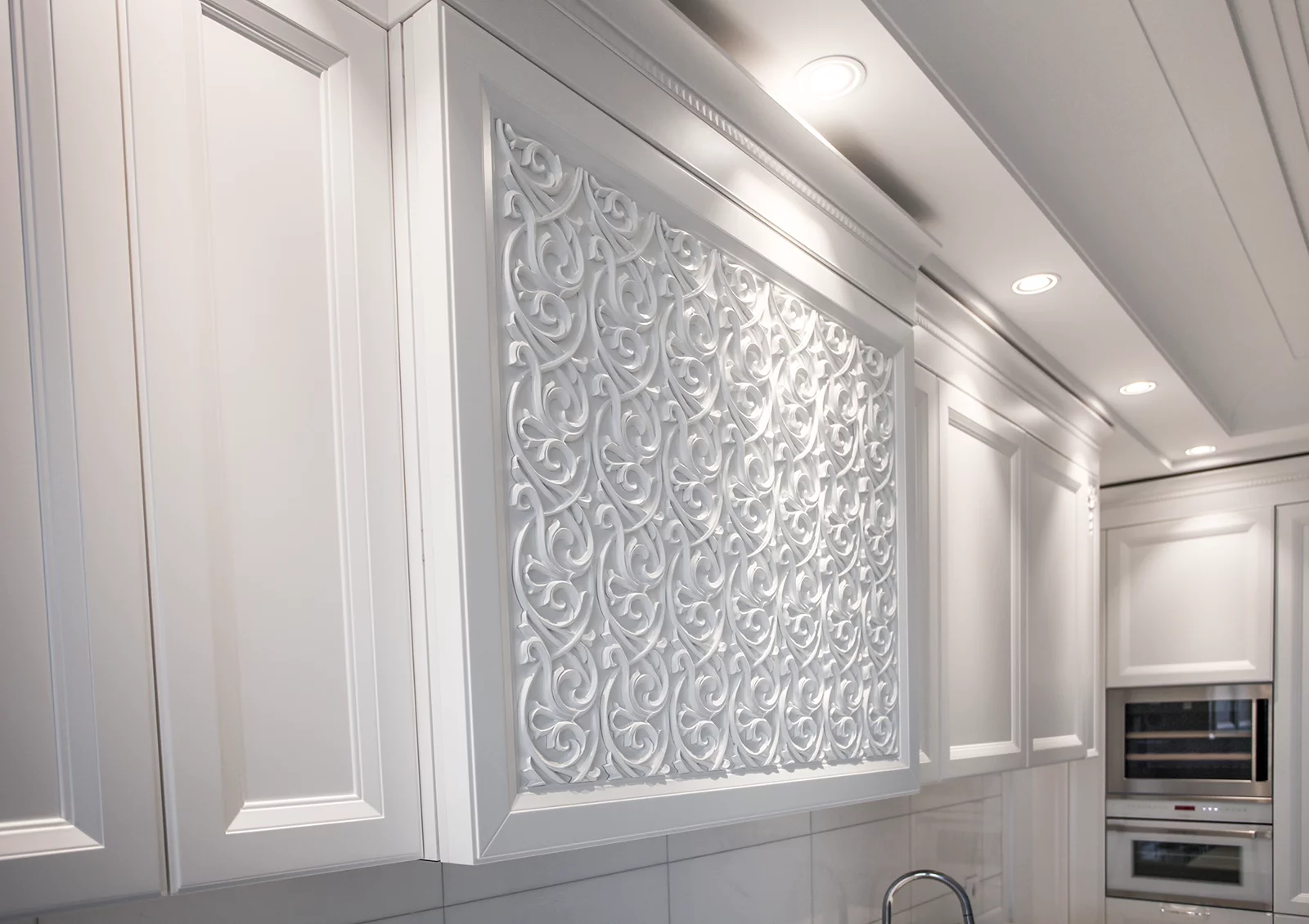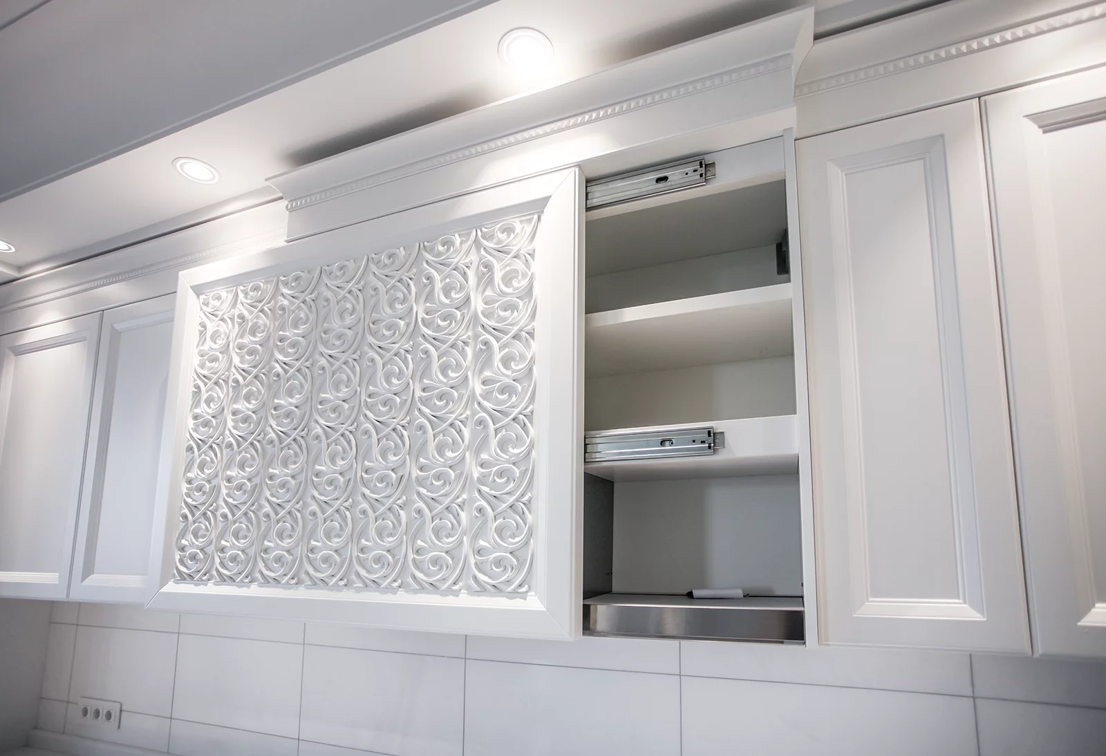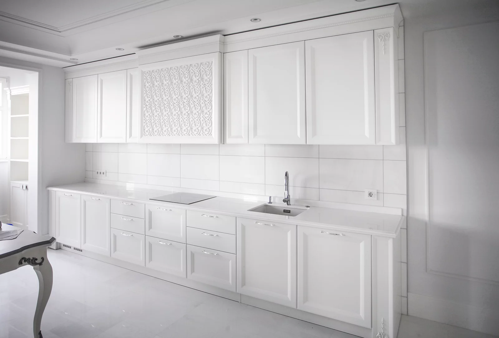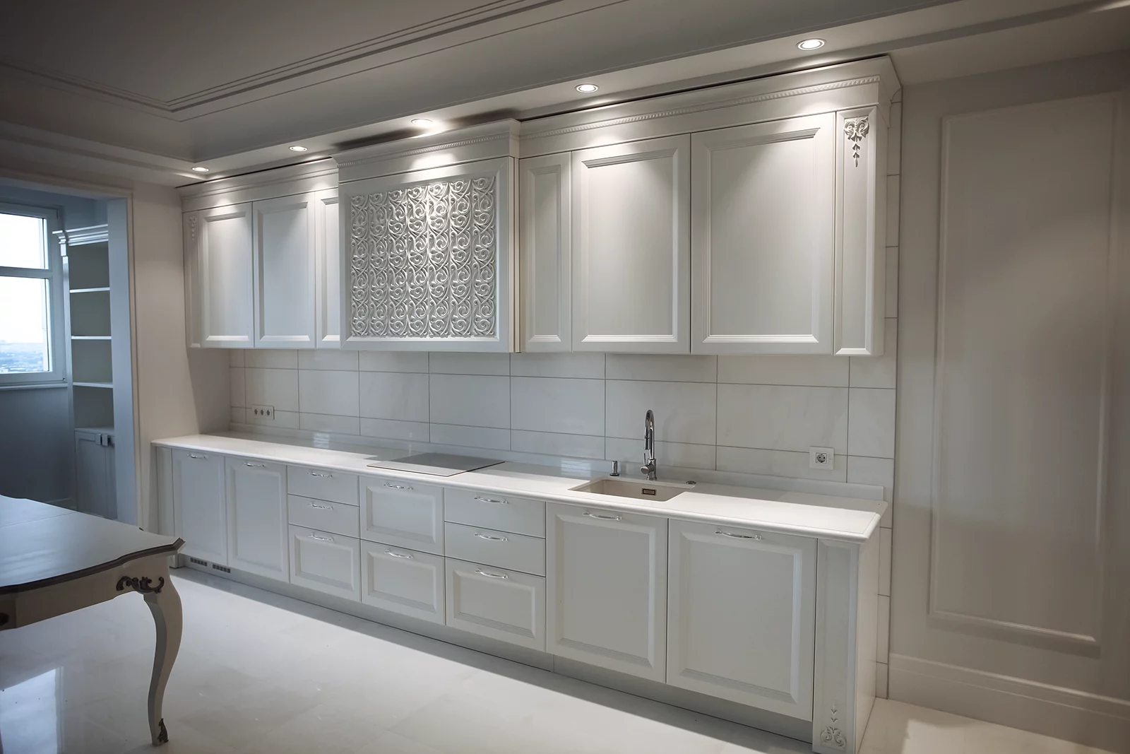 Проект кухни Princess от итальянской фабрики Castagna Cucine для квартиры в Москве. Гарнитур с фасадами белого цвета выполнен в стиле «современная классика» с элементами арт-деко. Над вытяжкой установлен раздвижной фасад с изящными резными элементами. Столешница изготовлена из кварцевого камня. Кухня укомплектована элитной бытовой техникой Kuppersbusch.