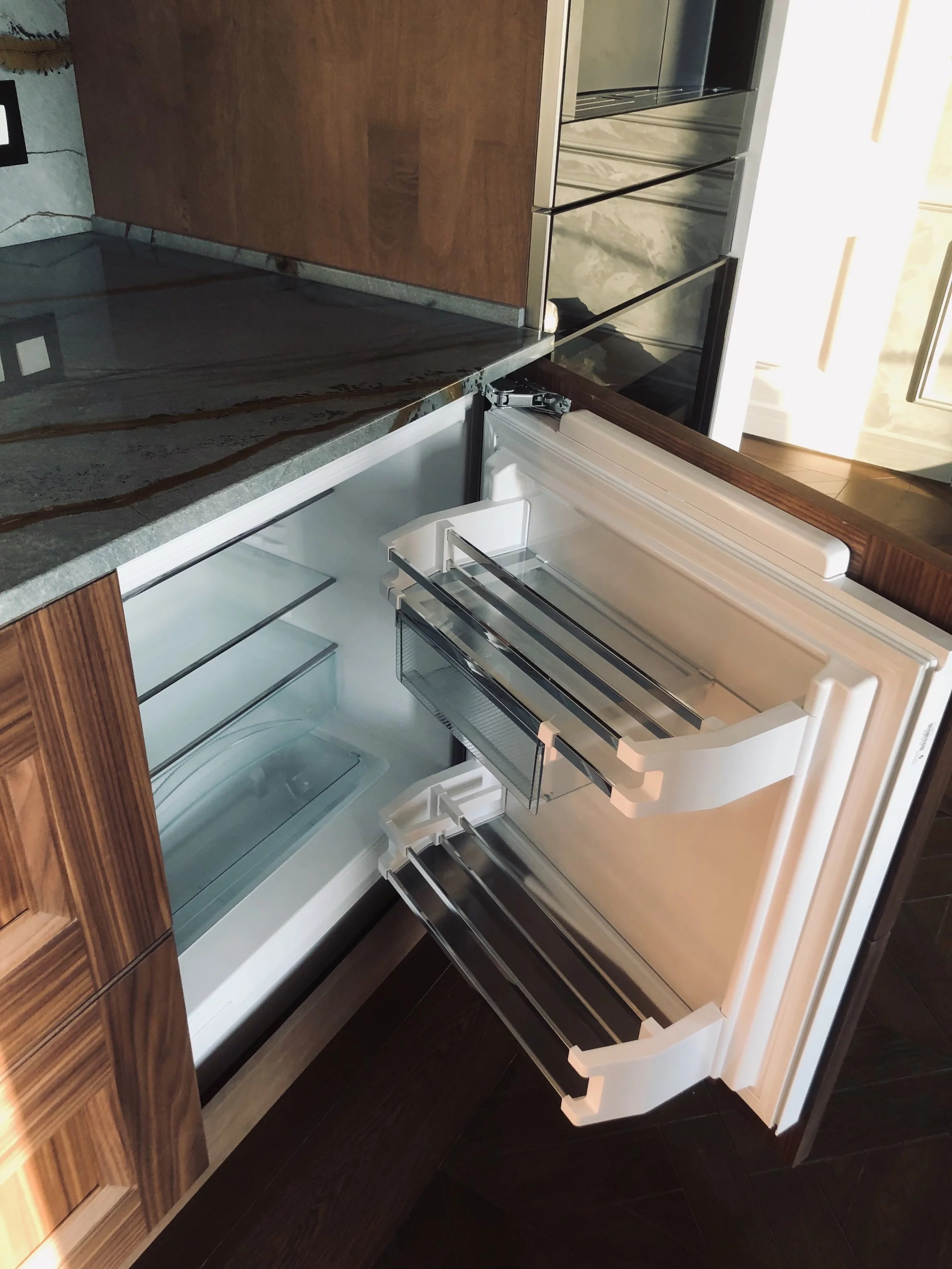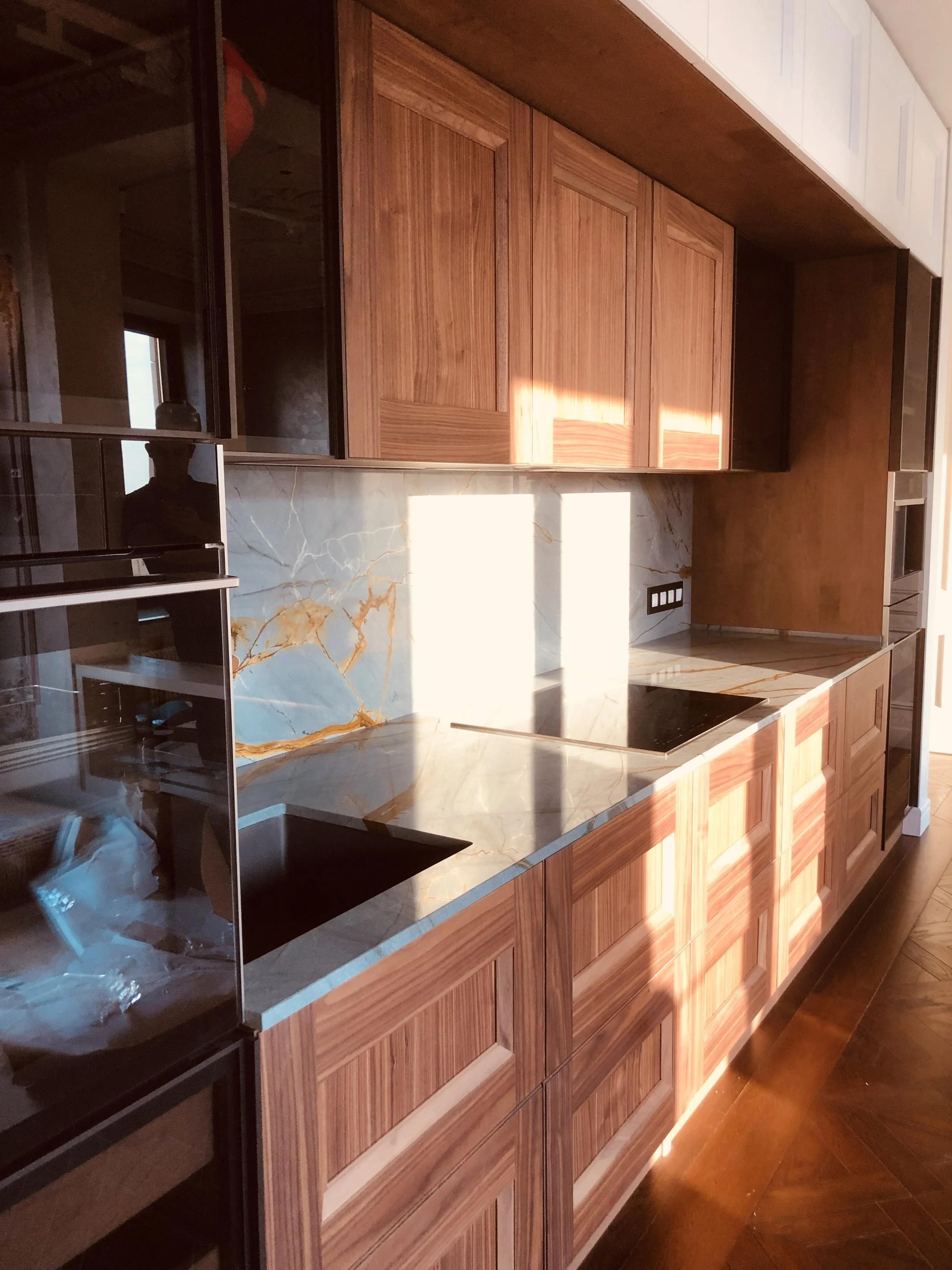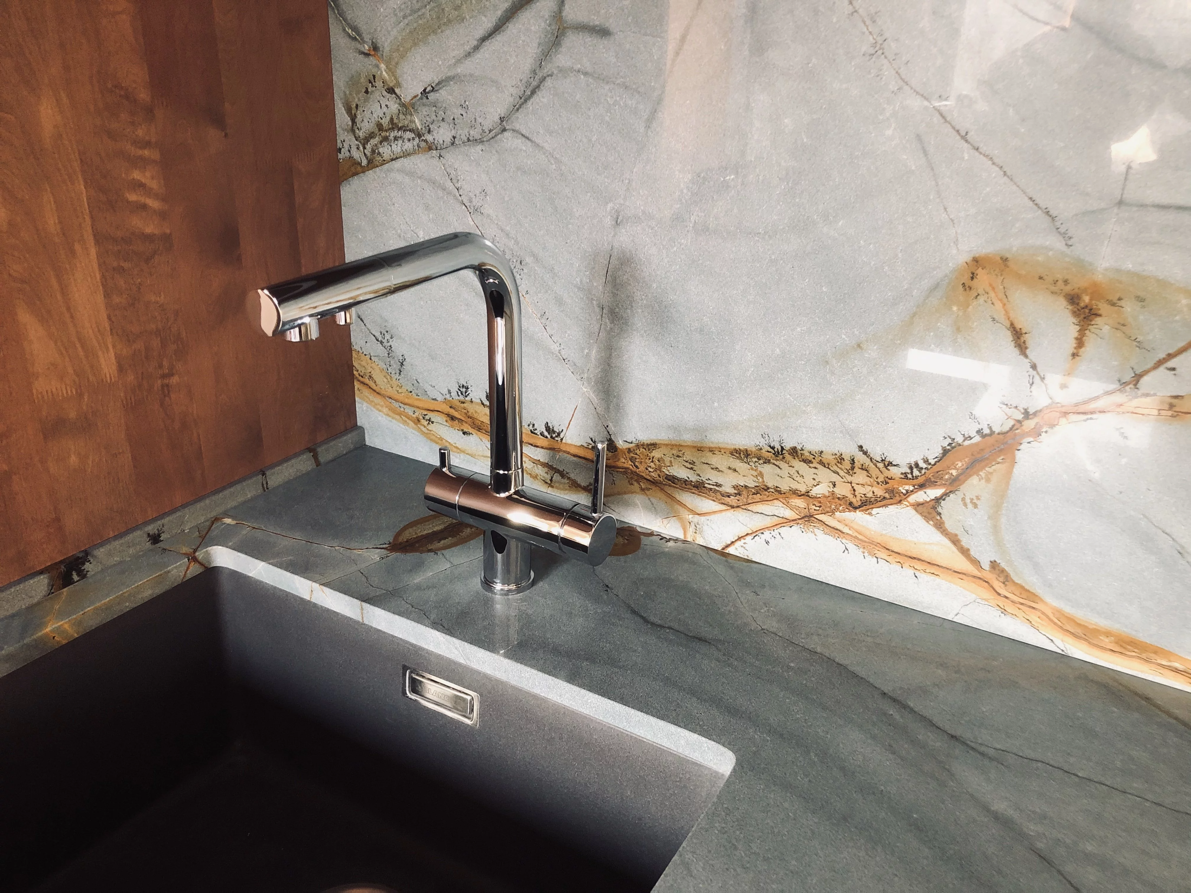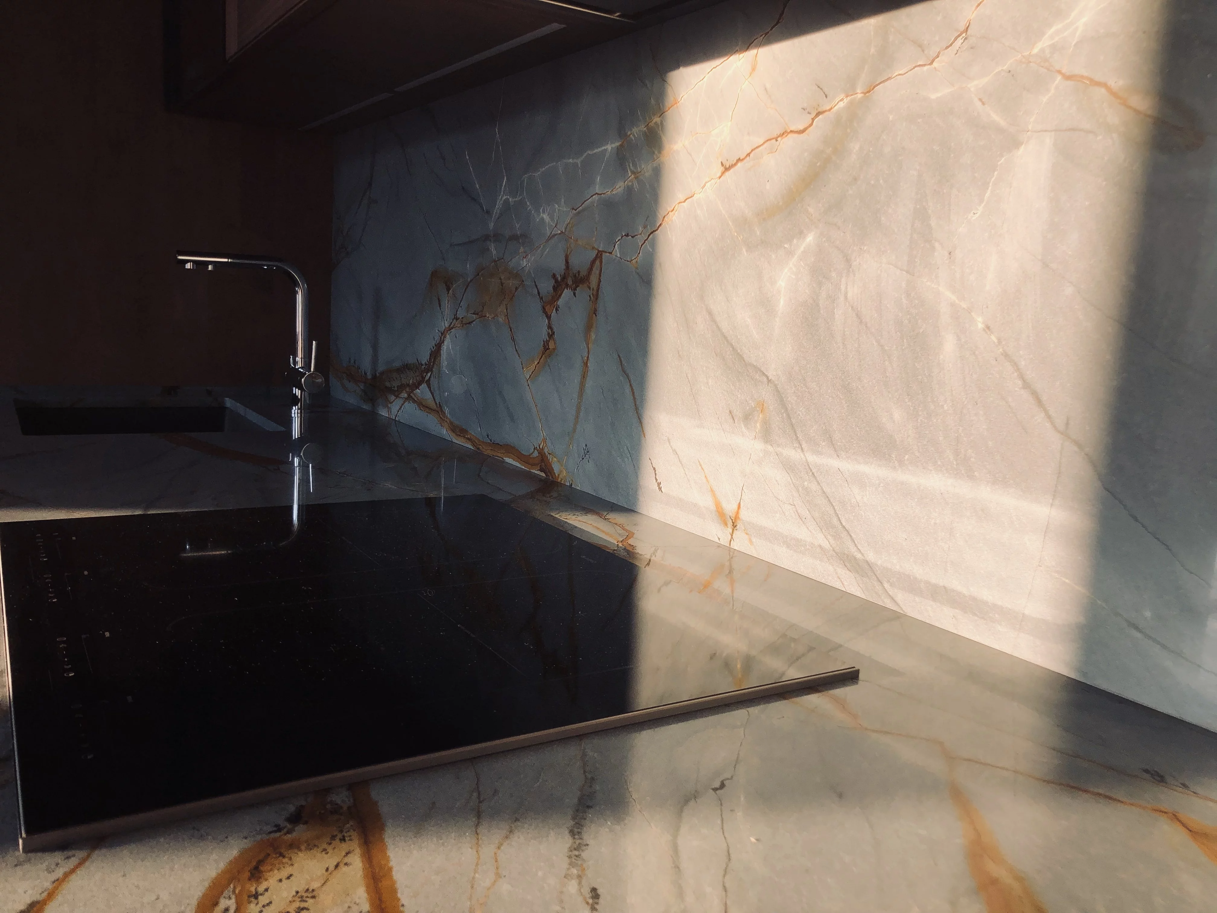 Столешница и стеновая панель изготовлены из итальянского кварцита. Рабочая поверхность имеет глубину 75 см, вместо стандартной в 60 см. Это позволяет разместить больше полезной утвари и делает процесс приготовления удобнее.