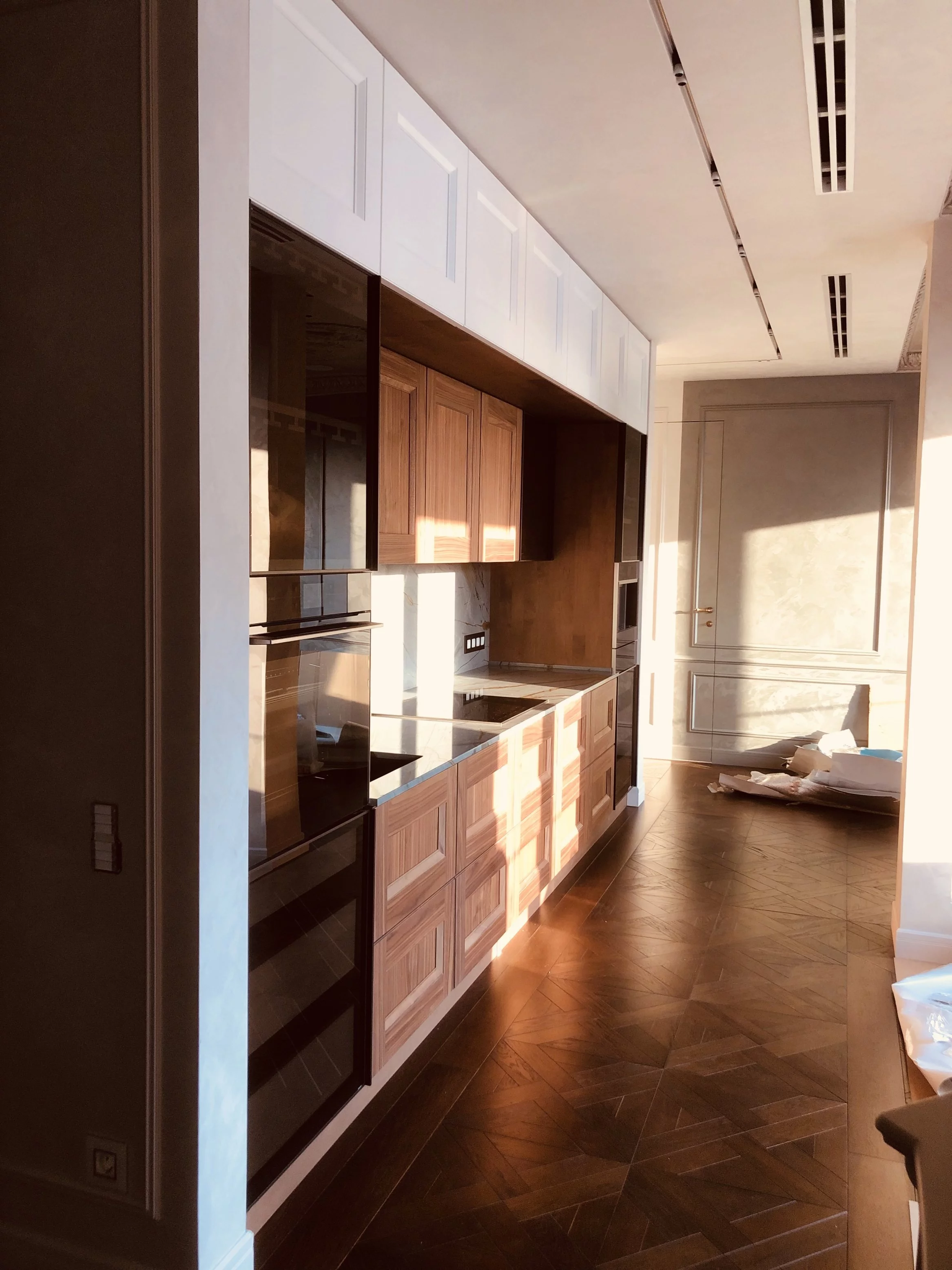 Композиция гарнитура — линейная. Расположена в нише. По бокам установлены колонны для бытовой техники; имеется 3-й ряд антресольных шкафов для хранения.