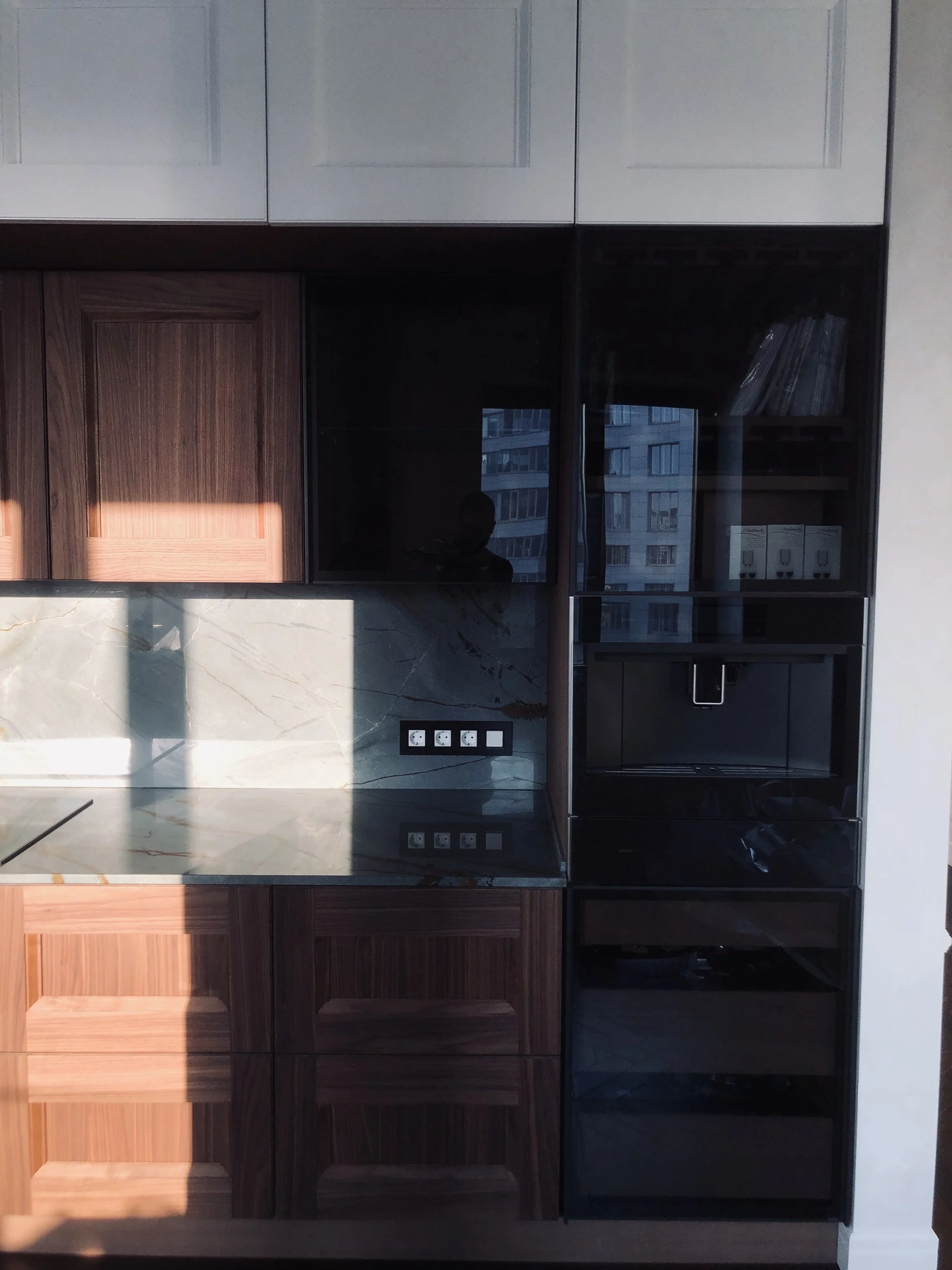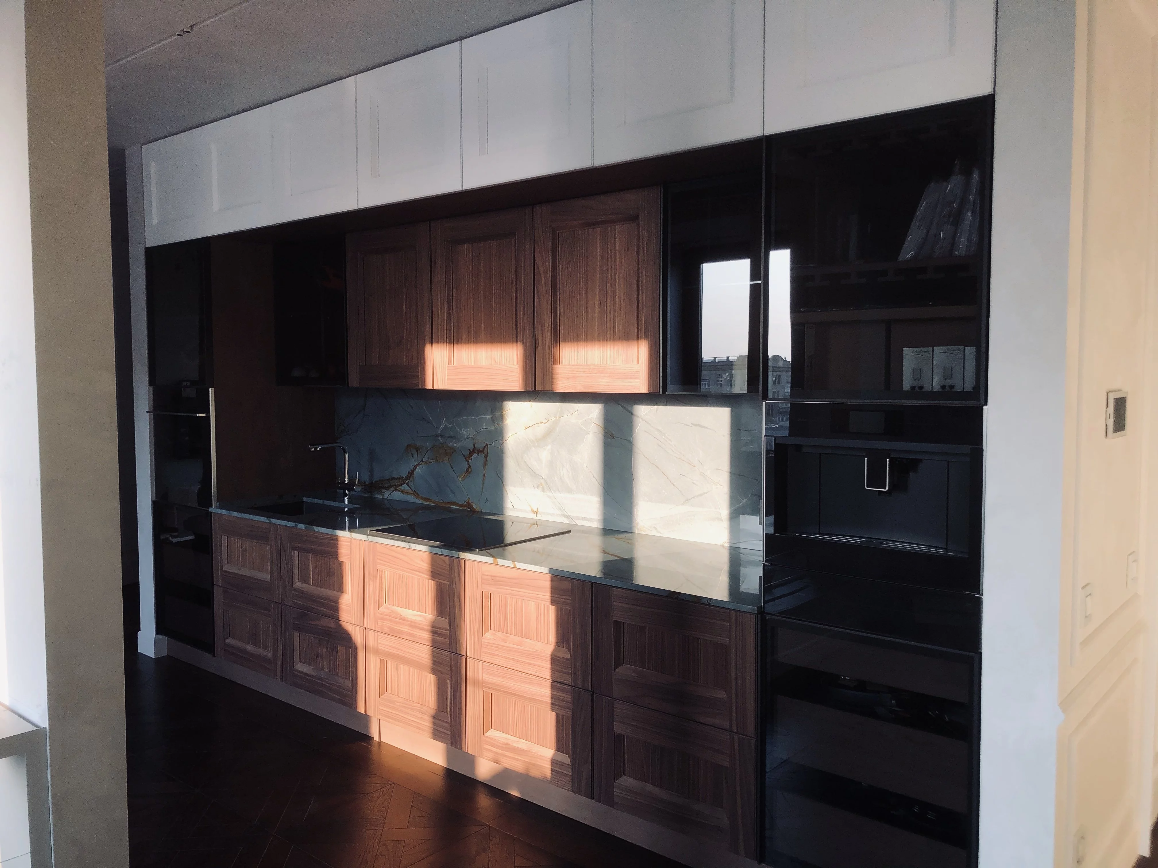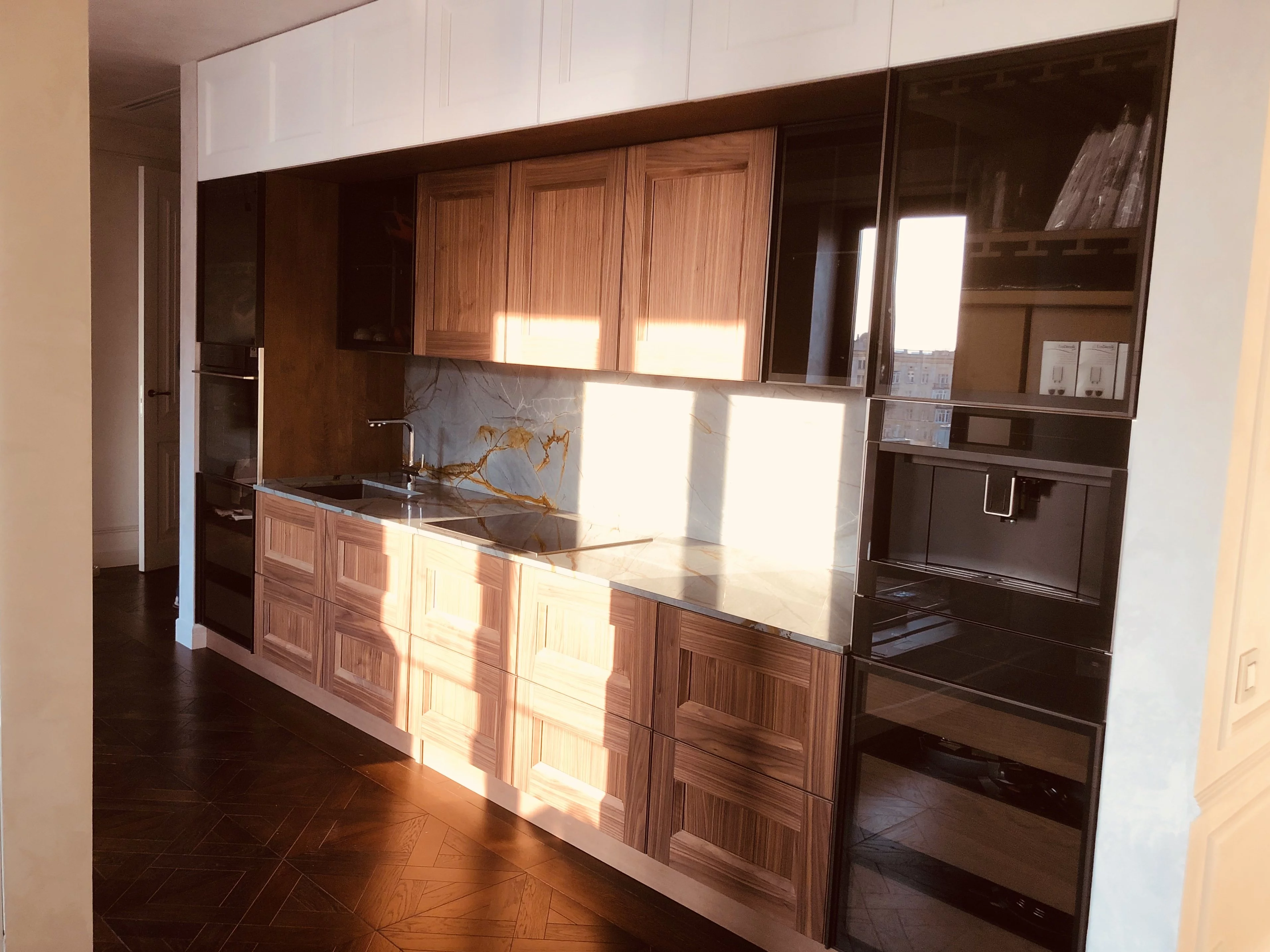 Глухие рамочные дверцы представлены в 2-х отделках: тонированный орех, покрытый матовым лаком и белая эмаль. Часть фасадов — остекленные, в тонкой металлической раме. Каркас выполнен из шпона ореха. Использована фурнитура Blum.
