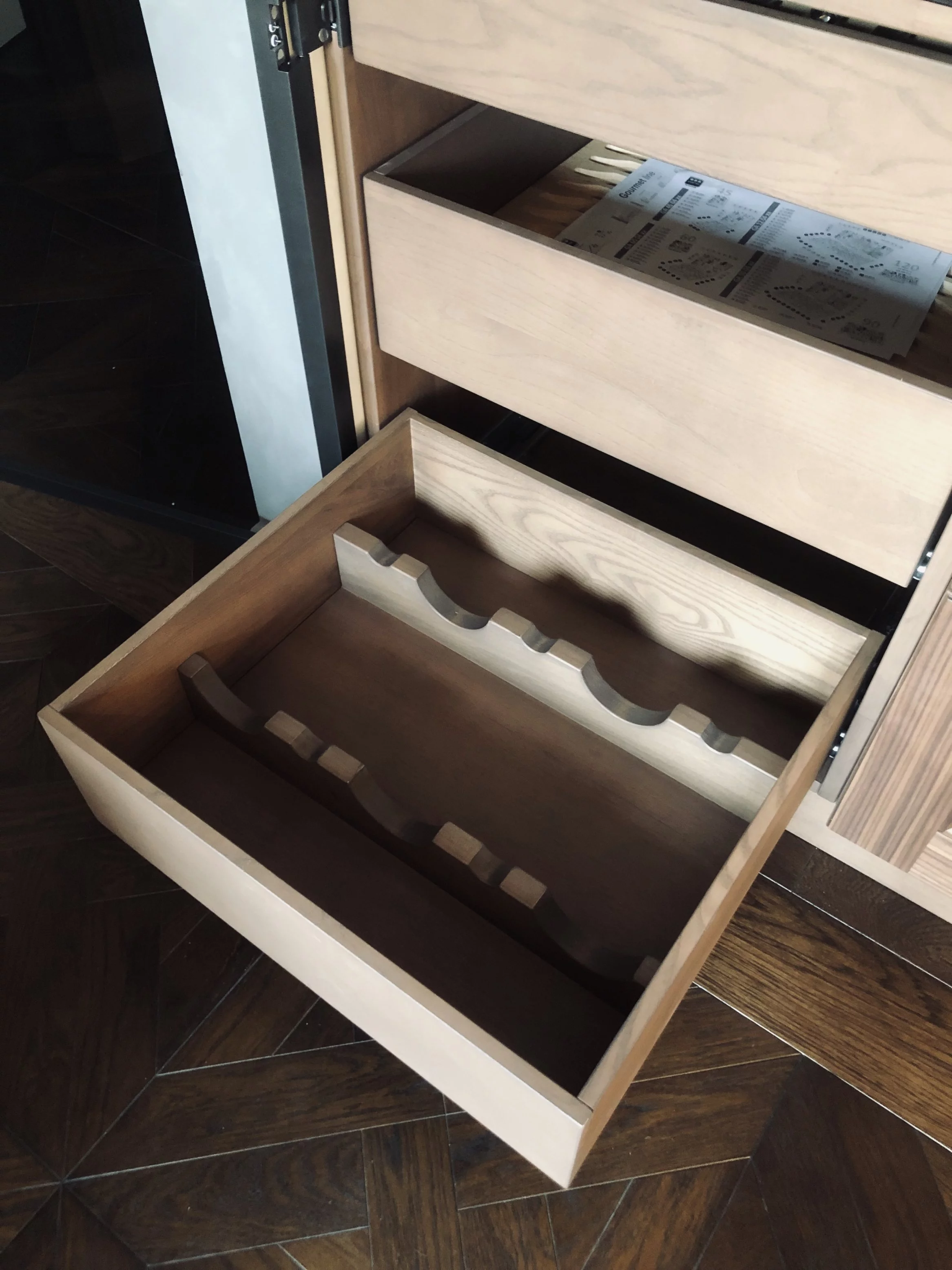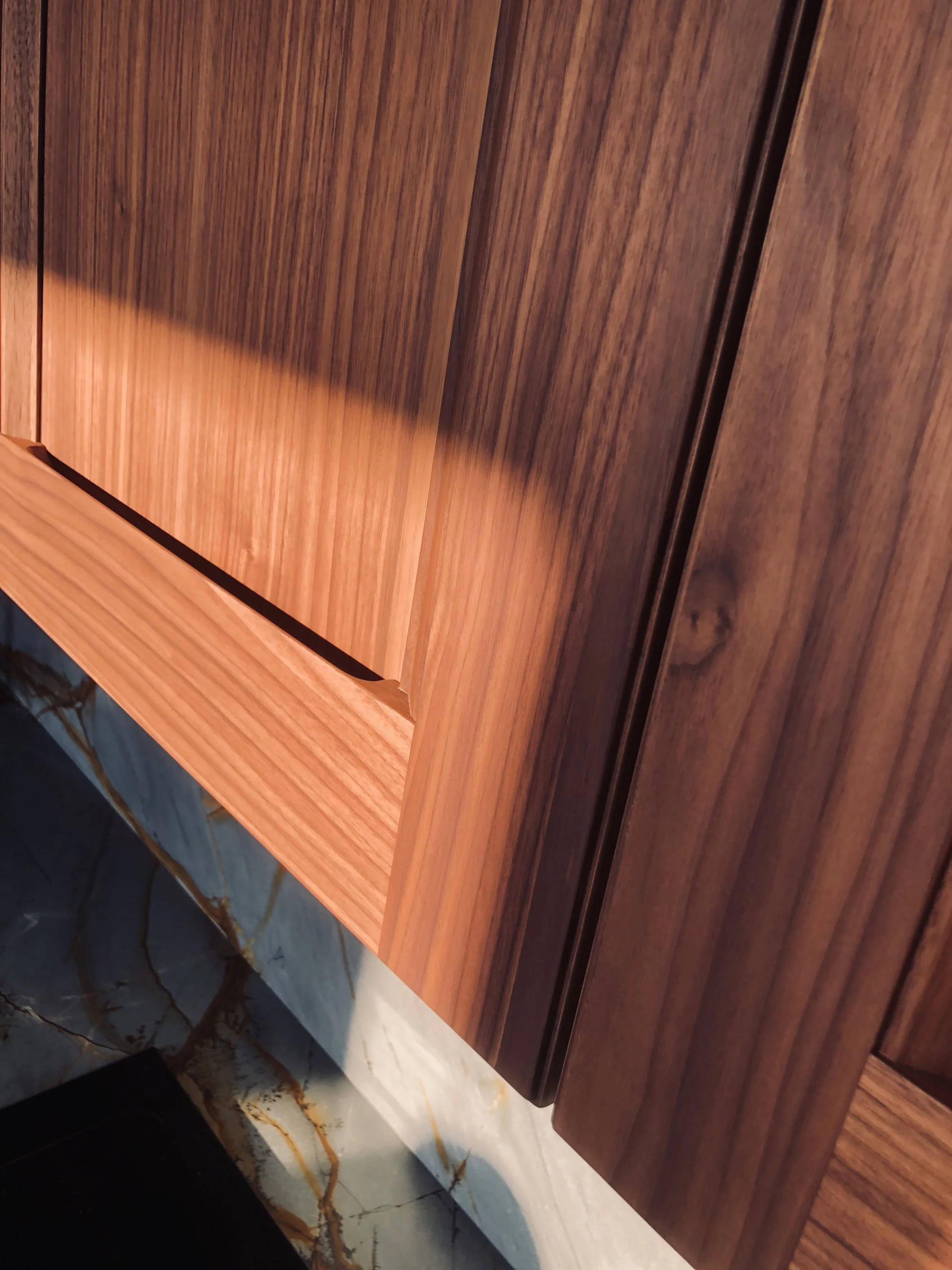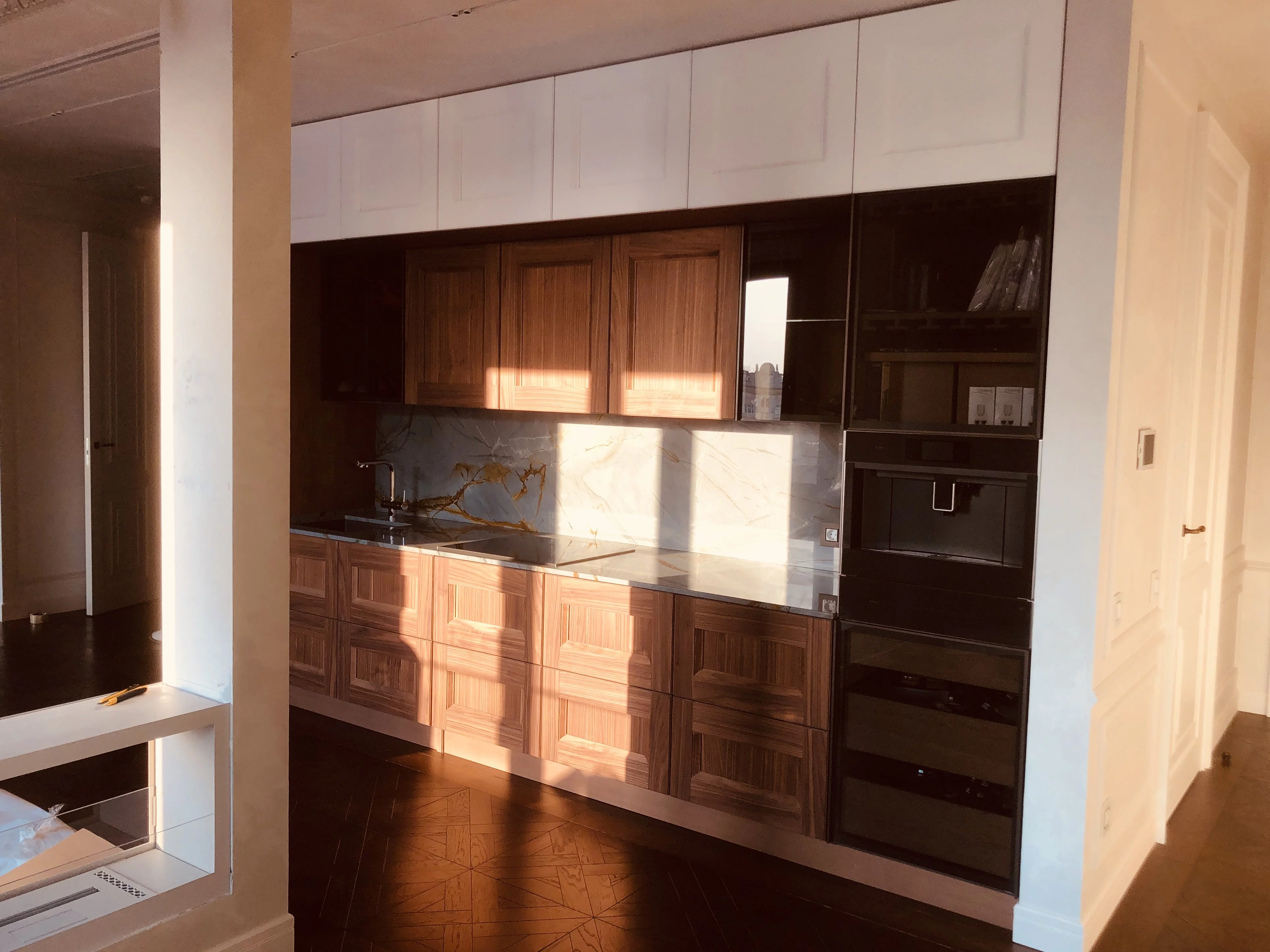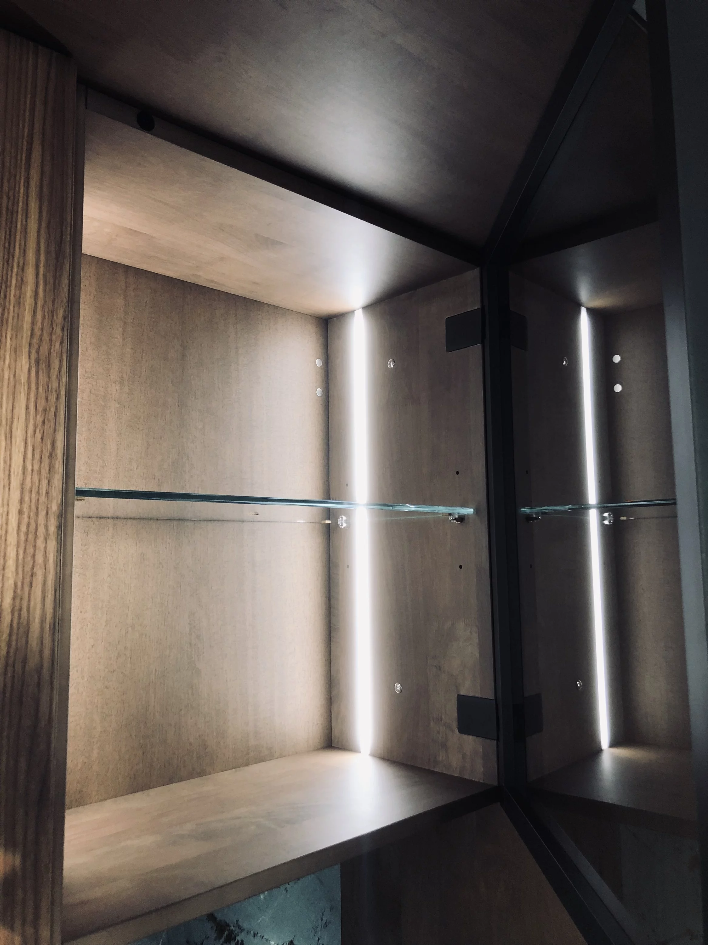 Глухие рамочные дверцы представлены в 2-х отделках: тонированный орех, покрытый матовым лаком и белая эмаль. Часть фасадов — остекленные, в тонкой металлической раме. Каркас выполнен из шпона ореха. Использована фурнитура Blum.