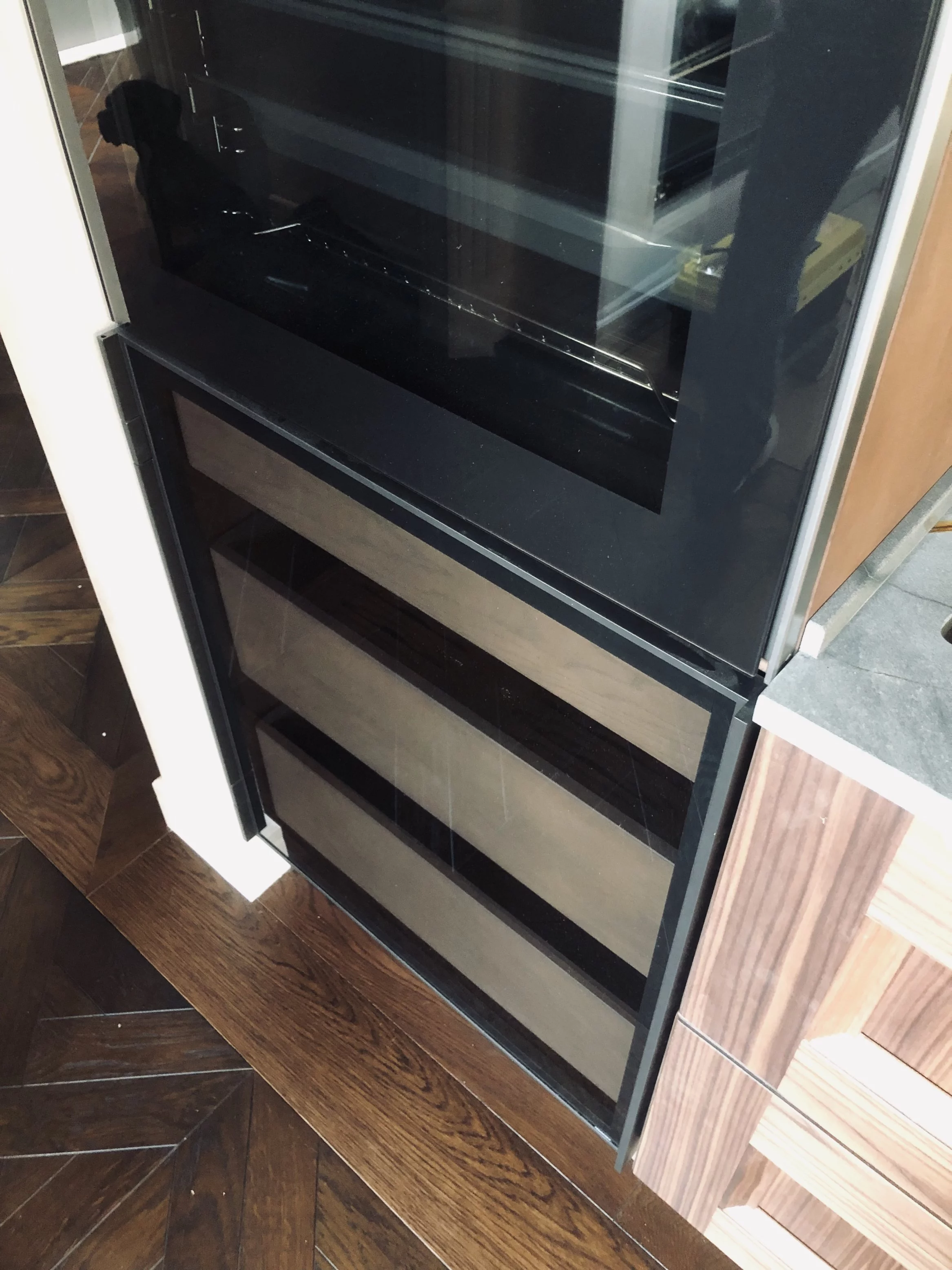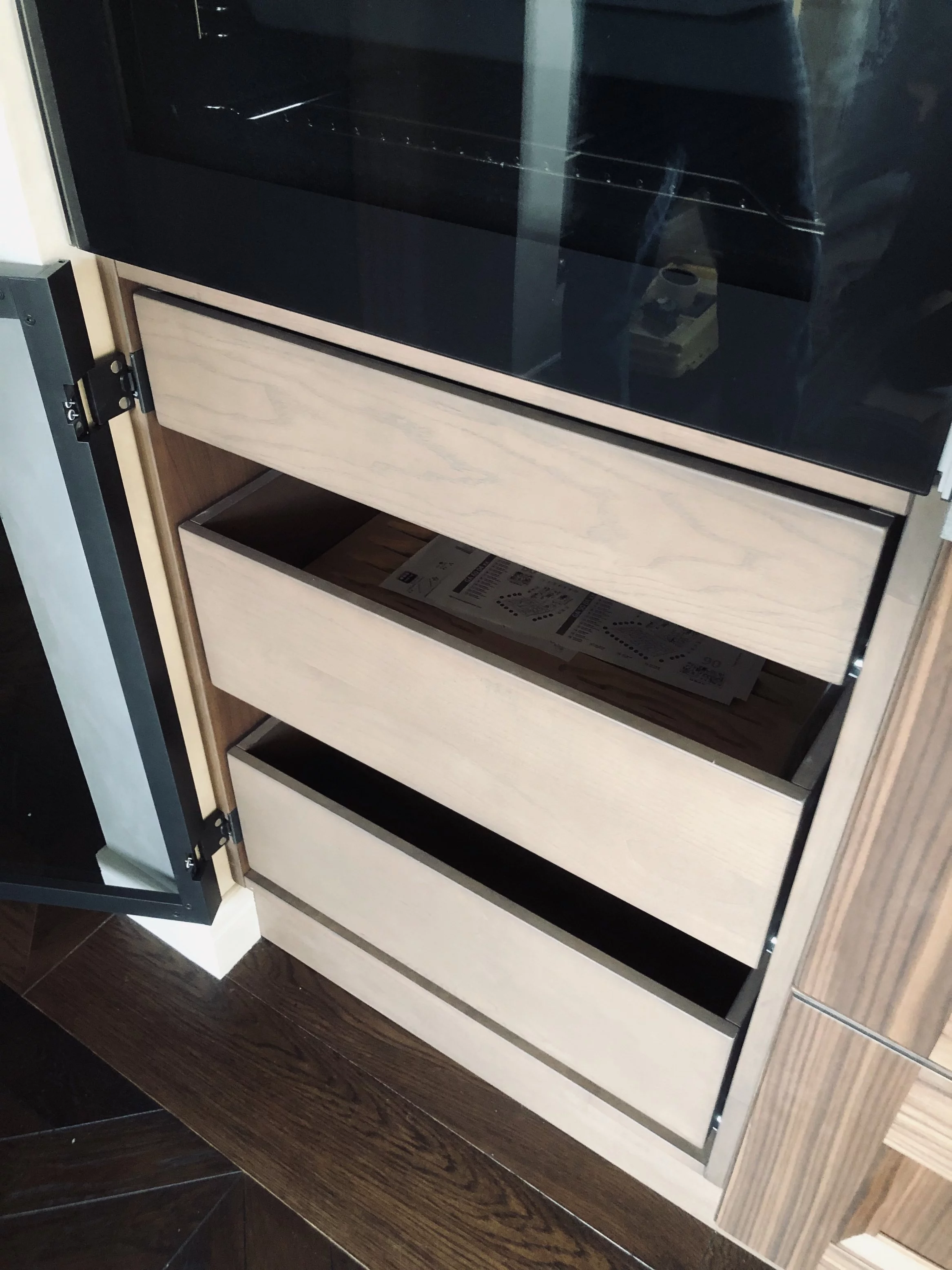 На кухне отсутствуют видимые ручки. Использованы механизмы открывания «по-нажатию» Tip-on, а также элегантная скрытая ручка, расположенная на нижней рамке у навесных фасадов.