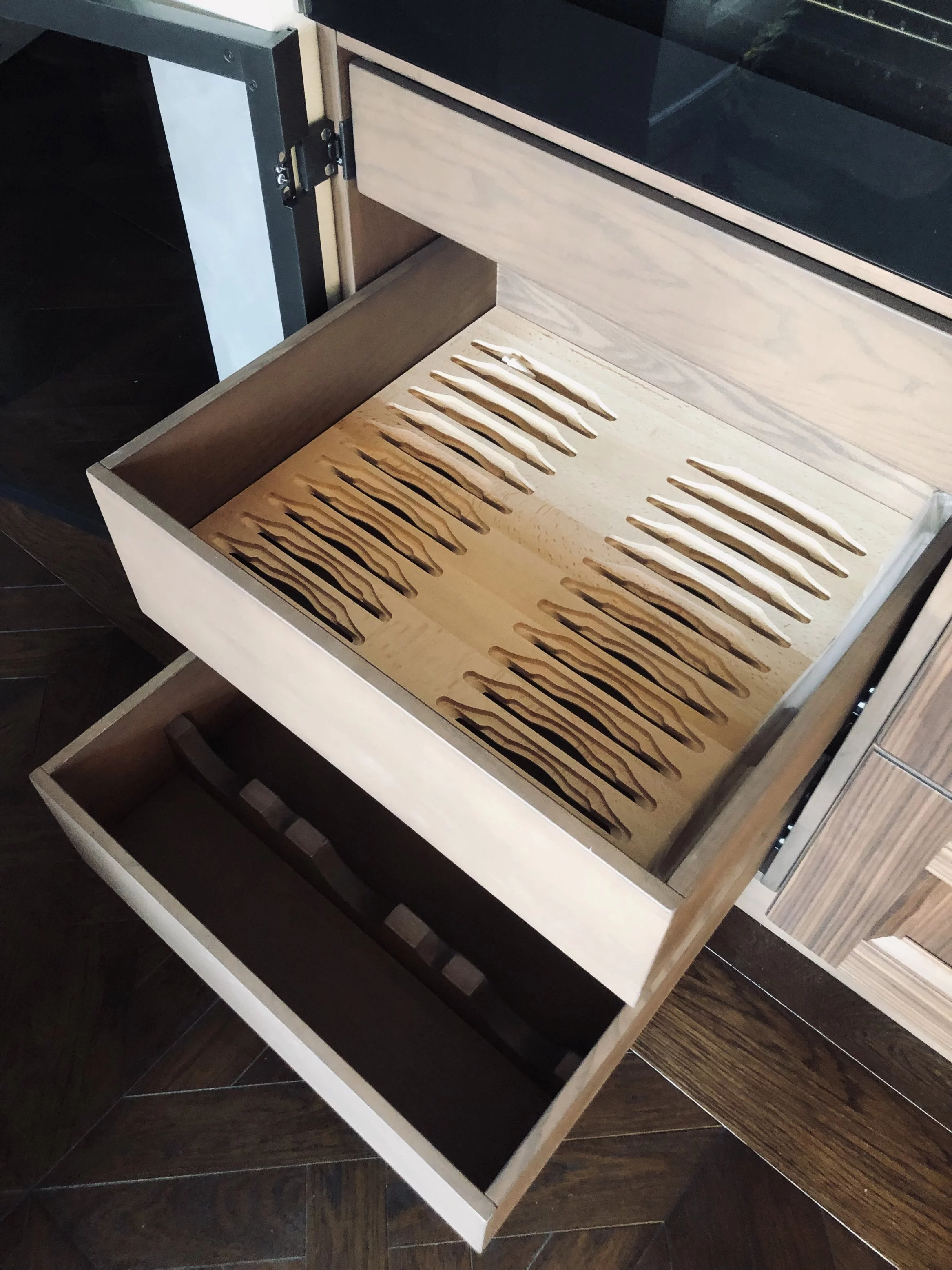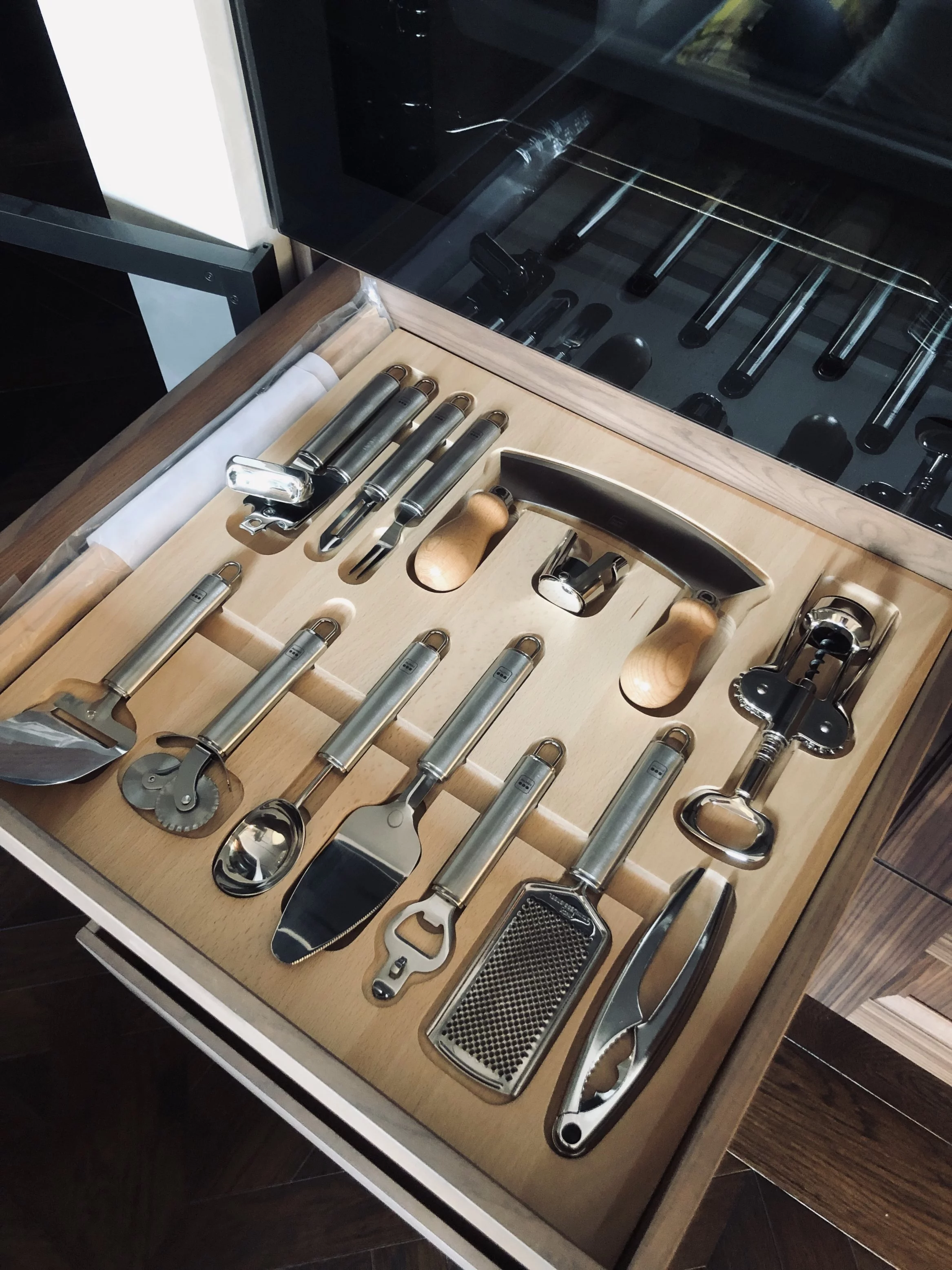 Кухня дополнена большим количеством полезных аксессуаров: лотки для столовых приборов, полки для бокалов, лотки для тарелок, банки для специй и сыпучих продуктов. Производство Old Line и Essetre.